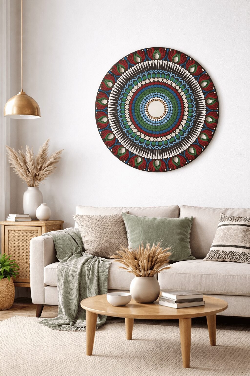 Each element of the design is meticulously hand-painted, showcasing traditional Indian craftsmanship combined with a contemporary color palette. The symmetrical patterns and vibrant colors make it a perfect accent piece for living rooms, hallways, bedrooms, meditation spaces, cafés, or boutique interiors.