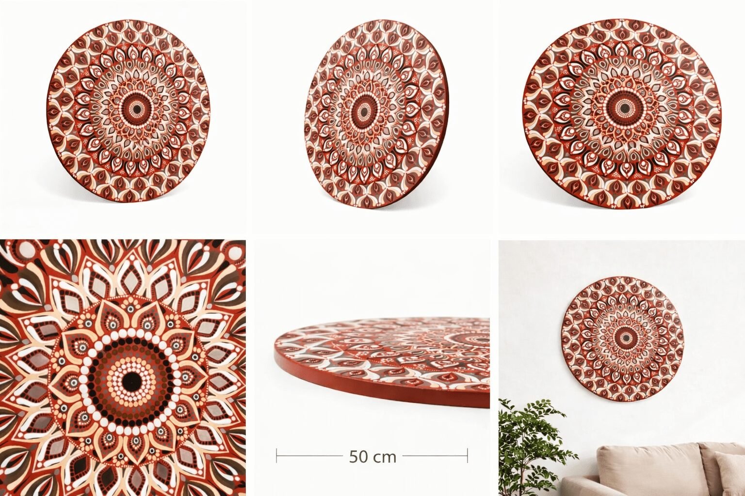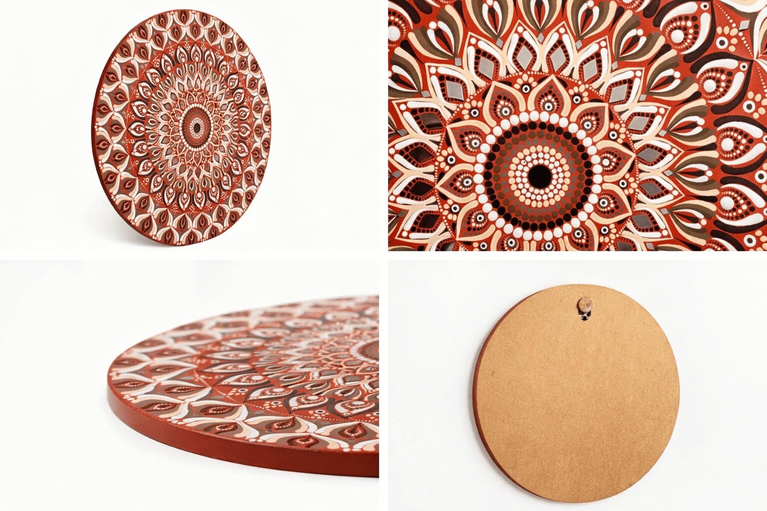 Bring warmth, harmony, and artisanal beauty to your space with this hand-painted mandala wall art, crafted with intricate detailing and rich earthy hues. Featuring a symmetrical circular mandala design in deep red, white, and natural brown tones, this piece reflects traditional Indian artistry and meditative geometry.