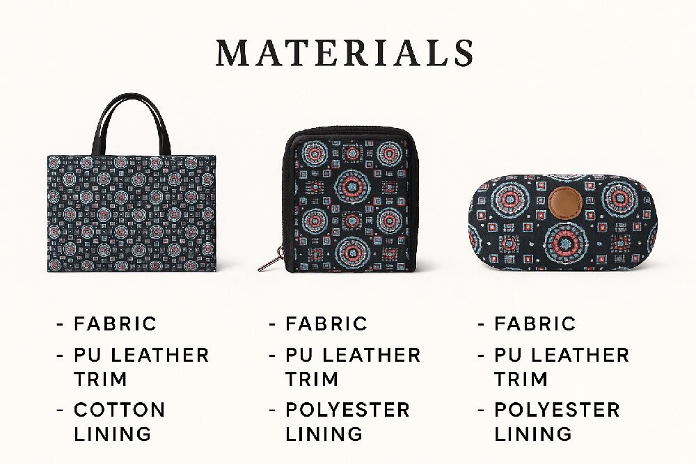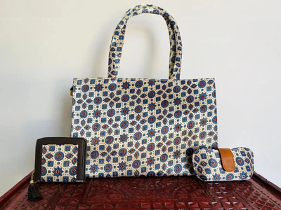 A stylish 3-piece combo set featuring a Ajarakh- Print tote bag, matching wallet, and compact pouch. Lightweight, durable, and beautifully coordinated—perfect for daily use, gifting, shopping, or travel