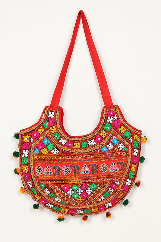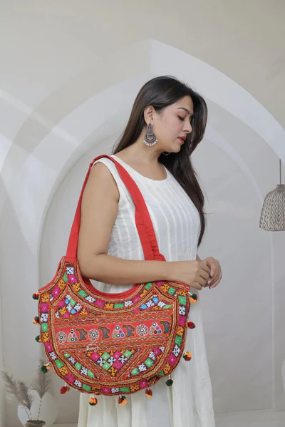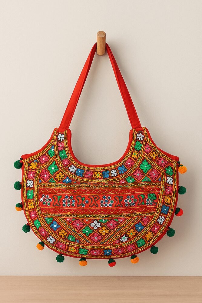 A vibrant handcrafted Banjara-style shoulder bag featuring rich multicolor thread work, mirrors, tassels, and bold red fabric. This boho statement piece is spacious, lightweight, and perfect for ethnic outfits, festive wear, or everyday styling.