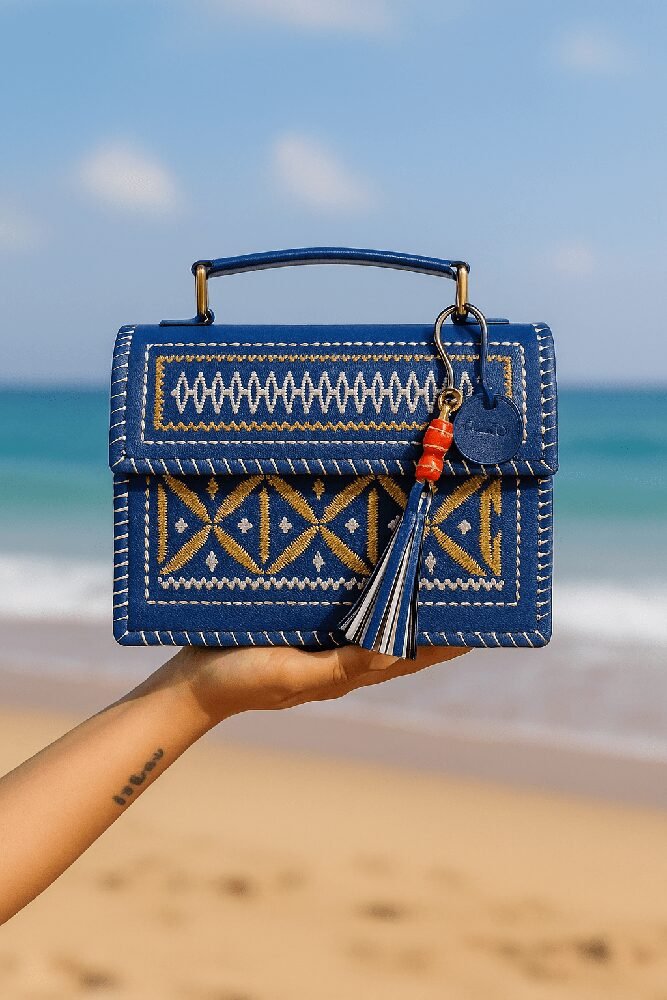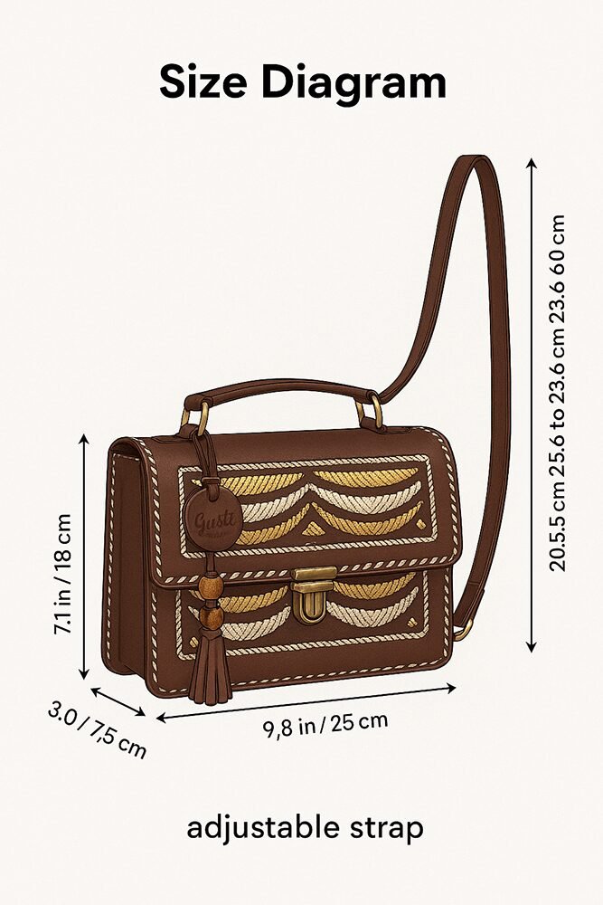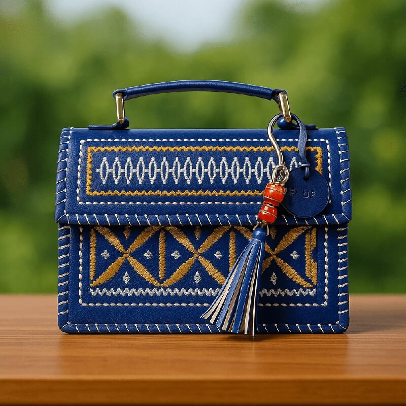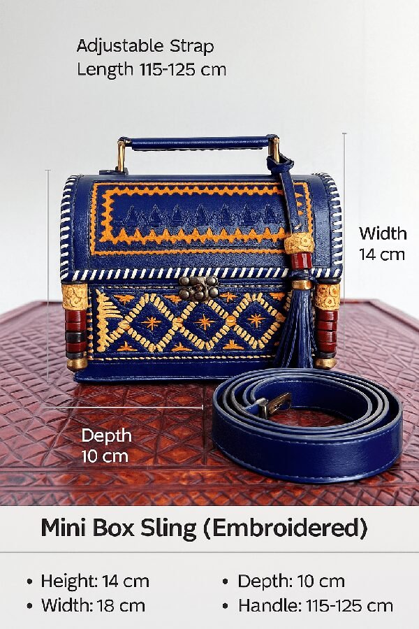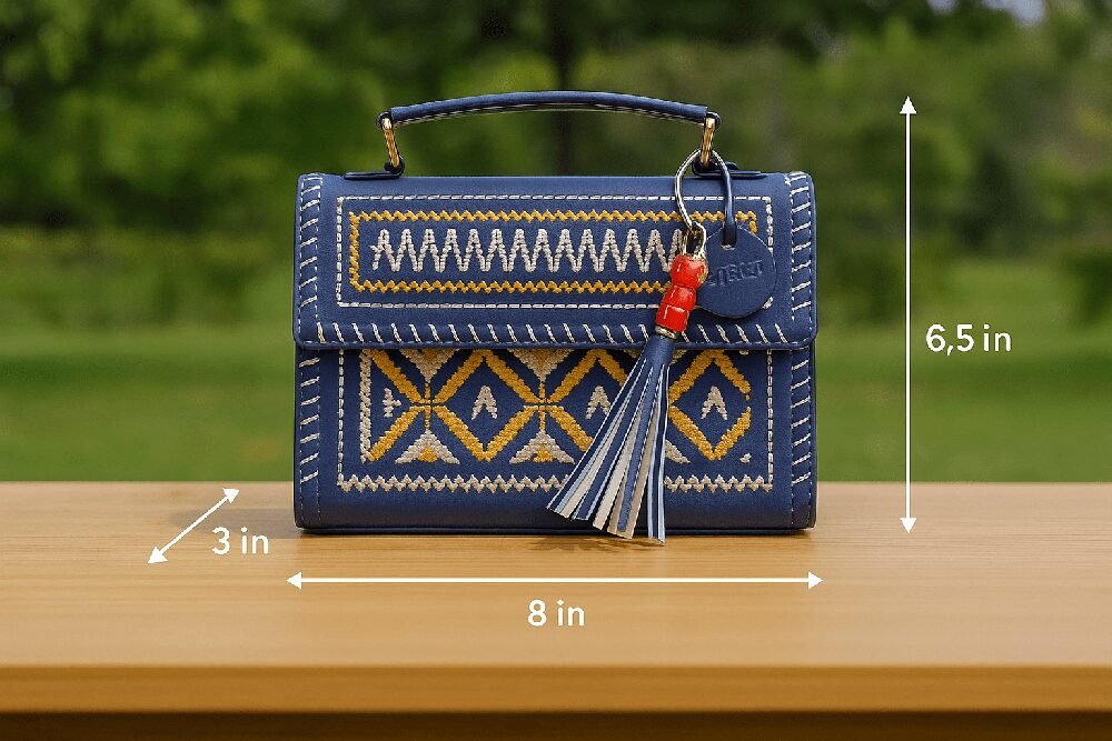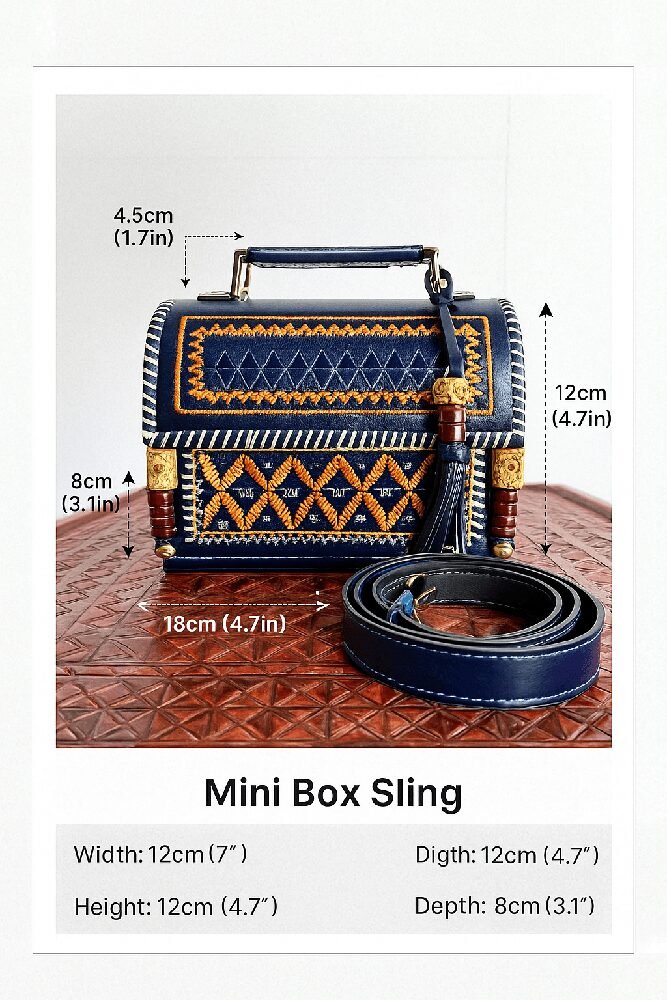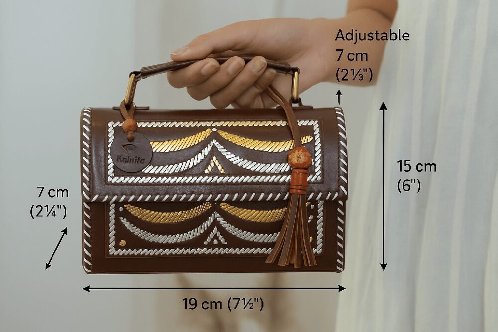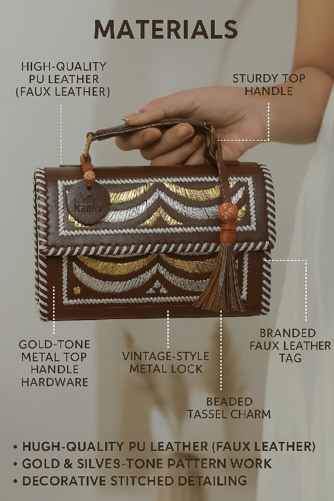 A premium handcrafted hut- shaped sling featuring elegant metallic gold and silver pattern work. Designed with a sturdy top handle, tassel charm, and clean stitched detailing, this compact bag adds a luxurious, ethnic–modern touch to any outfit. Perfect for festive looks, parties, and everyday elegance.