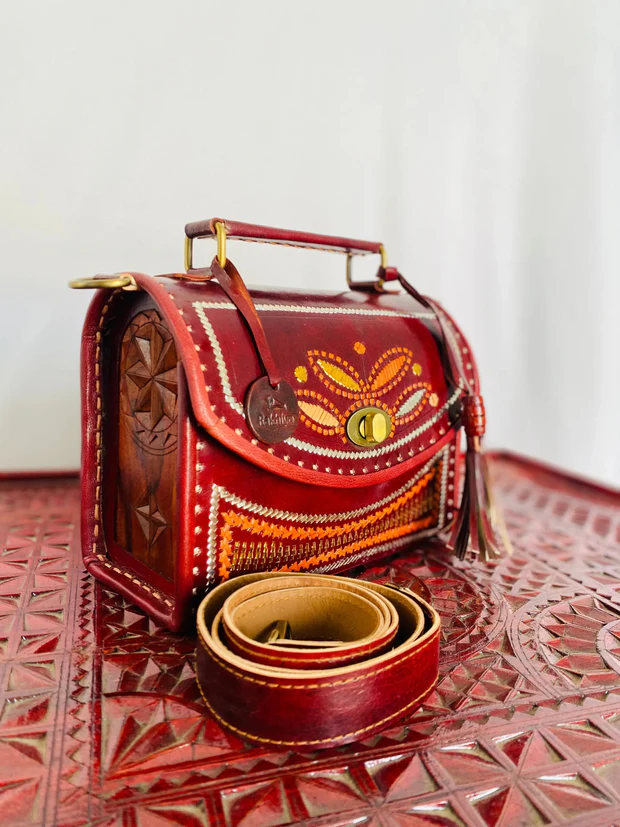 A beautifully handcrafted red leather-look box sling featuring intricate embossed patterns, multicolor stitching, and a vintage gold-tone lock. Complete with a sturdy top handle and detachable strap, this compact bag adds a bold ethnic–boho charm to any outfit.